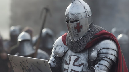 A valiant knight, clad in chainmail and armor, holds a sword and a shield featuring a red cross, embodying the spirit of medieval chivalry and valor.