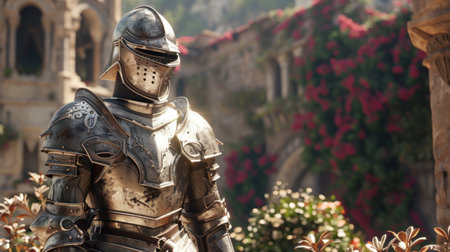 Medieval knight in full armor holding a sword standing in a historic castle courtyard