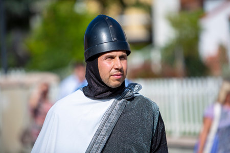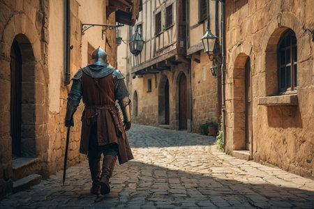 Knight in medieval clothes walking down a cobblestone street in the old town