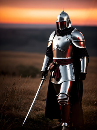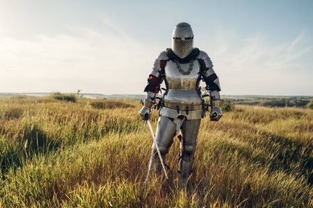 Knight in armor and helmet holds sword