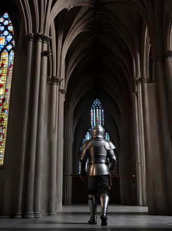 Knight in silver armor in gothic church during sunset detailed cinematic Generative AI Generated
