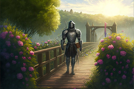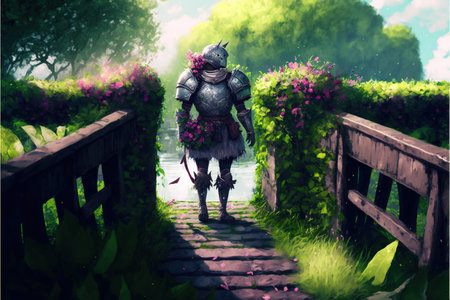 knight walking on wooden bridge surrounded by green vines and flowers , digital art style, illustration painting, fantasy concept of a knight on the wooden bridge