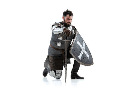 Portrait of brutal seriuos man, medieval warrior or knight with dirty wounded face running with big sword isolated over white background.