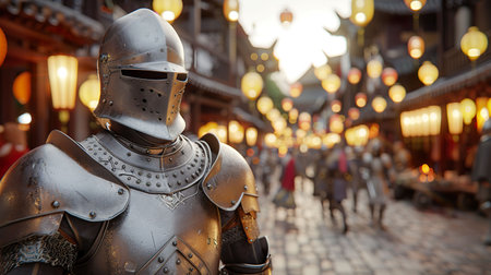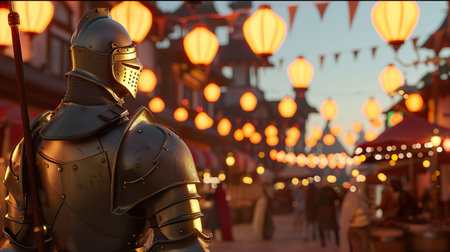 A knight in armor stands confidently among a bustling crowd in a vibrant street during a festive event.