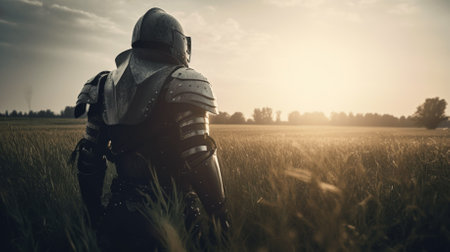 An AI generated illustration of a soldier in knightly regalia walking through a sunlit field of tall grass, with the sun visible in the background