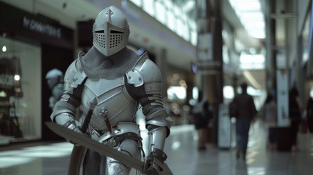 An AI generated illustration of a fierce warrior navigating a bustling shopping mall