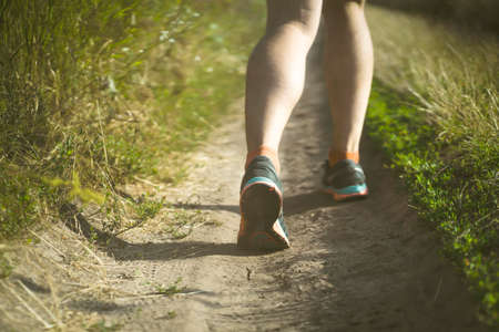 Rear view photo of female tourist legs with sneakers walking in a forest road.Summer day sunshine.Selective focus.Soft focus.
