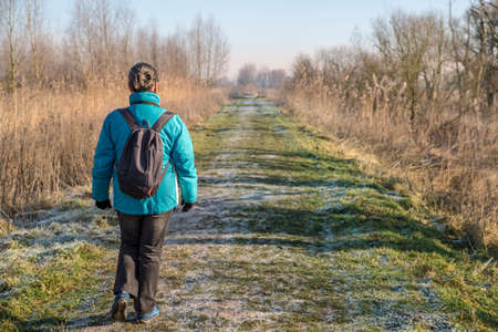 Woman with a backpack is hiking on a trail in nature, in a winter landscape