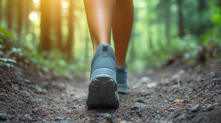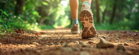 A person's journey along a beautiful hiking trail, with a focus on their hiking shoes and the path ahead