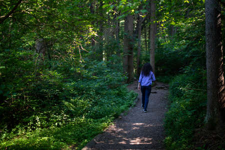 Young woman hiking on a trail in the Great Smoky Mountains National Park, Tennessee, in early summer.