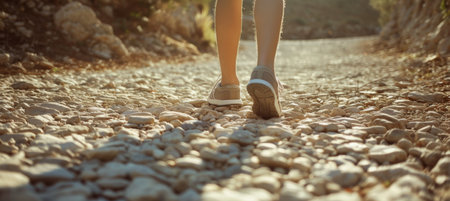 Close up of female legs walking on a gravel path in the mountains