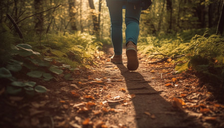 A person walking along a forest trail, with sunlight filtering through the trees generative ai
