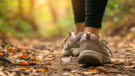 Close-up of feet walking on forest path with fallen leaves. Hiking adventure