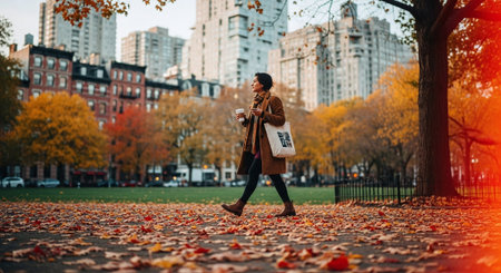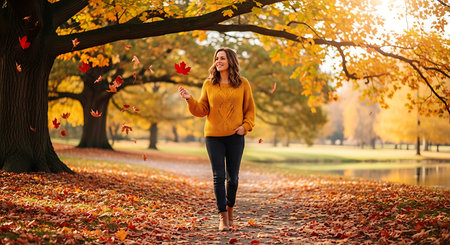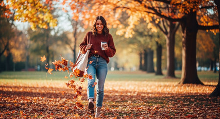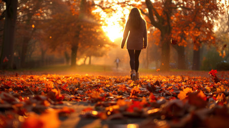 A person strolls through a park covered in golden leaves, enjoying the crisp air of autumn. The sunlight filters through the trees, creating a warm, inviting atmosphere.