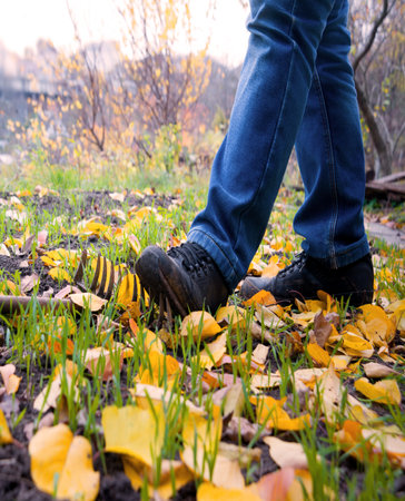 overhead of woman's legs with boots on ground with fallen leaves, autumn concept