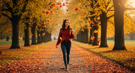 Beautiful young woman walking in the autumn park and drinking coffee.