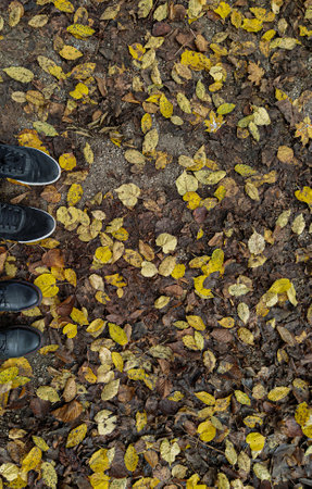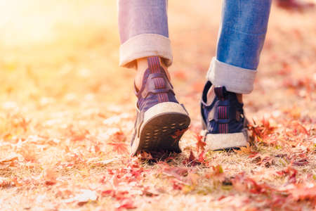 Feet sneakers walking on autumn leaves outdoor with autumn season nature