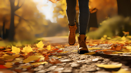 Close up of woman legs walking in autumn forest with fallen leaves.