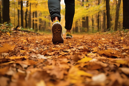 Low angle view of sole of female foot in running shoes walking through beautiful autumn forest lit by the sun.