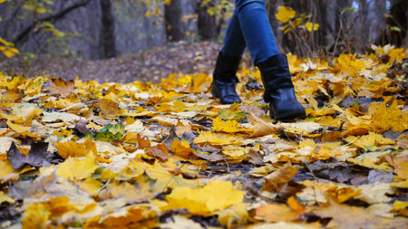 Human legs walking among fallen autumn yellow maple leaves. Woman feet standing on dry gold leaves in natural parkland. Low section of female hiking in autumn forest. Lifestyle