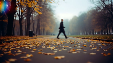 An AI generated illustration of A man walking , autumnal leaves on the ground