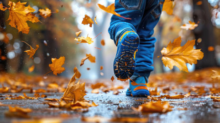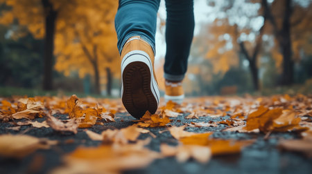 Footsteps crunch through colorful fallen leaves as an individual strolls along a winding path in a serene park. Autumn trees provide a vibrant backdrop.