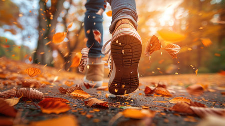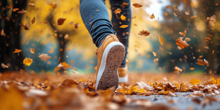 Person Walking on Leaf-Strewn Path in Autumn, Close-Up of Shoes and Falling Leaves in Sunlit Nature