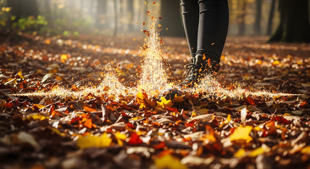 A person's feet in boots walk through a forest floor covered in crisp autumn leaves, creating a magical effect with each step. A trail of glowing golden particles rises from the leaves, blending the natural beauty of fall with a touch of fantasy or digital energy. This conceptual image represents an enchanted journey or a connection between nature and technology.