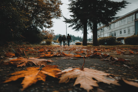 Three urban dwellers stroll through a city park during autumn, surrounded by fallen leaves and serene nature, encapsulating a moment of casual interaction in a vibrant environment.
