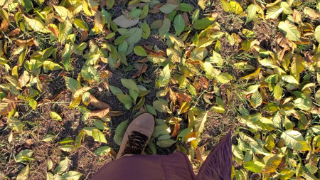 POV feet wearing hiking boots step and walk by autumn leaves covered ground in park at sunny fall weather. Tranquil fall background. Orange and yellow fallen leaves in autumn forest