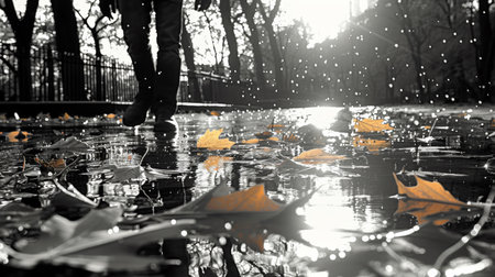 A person walking through a puddle of leaves in the rain, AI