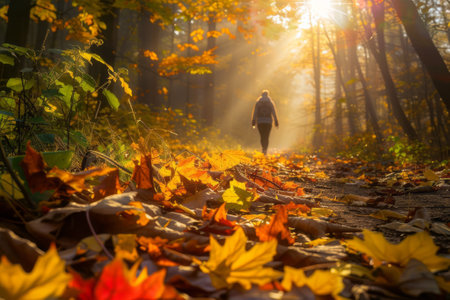 Sunlit autumn forest path covered with colorful fallen leaves, silhouette of a person walking in distance. AI generative