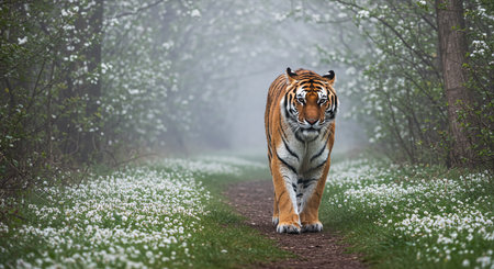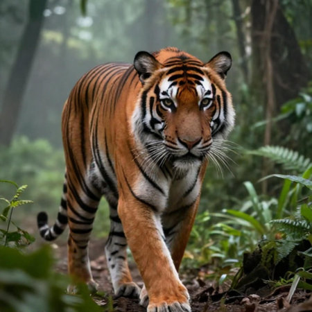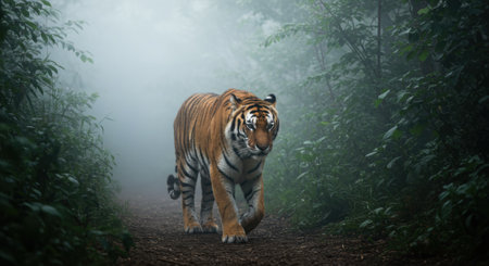 A powerful tiger walks confidently on a dirt path through a dense, misty forest. Lush green foliage lines the mysterious, fog filled environment, highlighting the wild animal natural habitat.