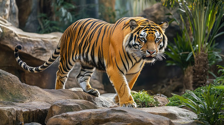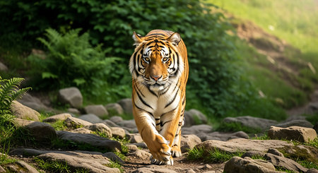A stunning tiger gracefully walks across rugged terrain, showcasing its vibrant orange coat and striking stripes amidst lush greenery, embodying nature's beauty.