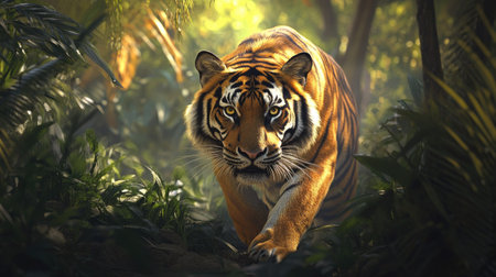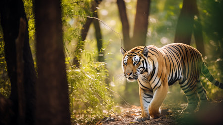 A Bengal tiger prowling through the dense jungle, its majestic form highlighted by the soft sunlight.