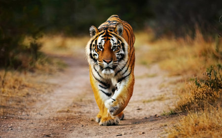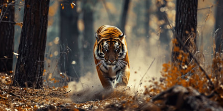 Majestic Tiger Sprinting at Full Speed in Lush Jungle Environment. Concept of Wildlife Power, Animal Agility, Nature Motion, Jungle Habitat, fast running.