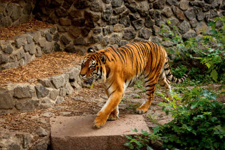 Orange and black striped bengal tiger walking on the rock
