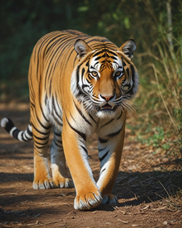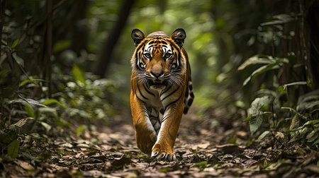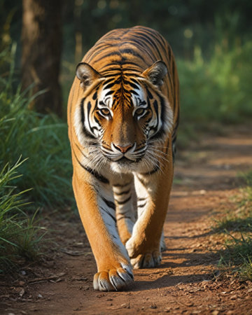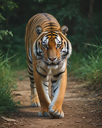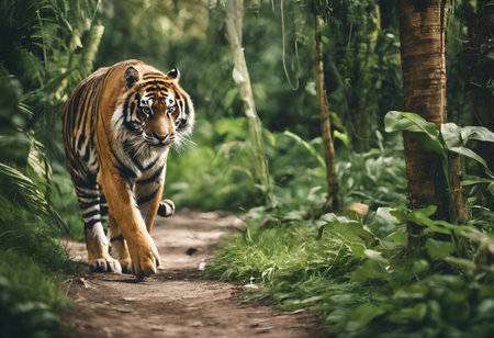 A stunning image of a majestic tiger walking confidently through a lush jungle pathway, surrounded by vibrant greenery, showcasing its beauty and power.