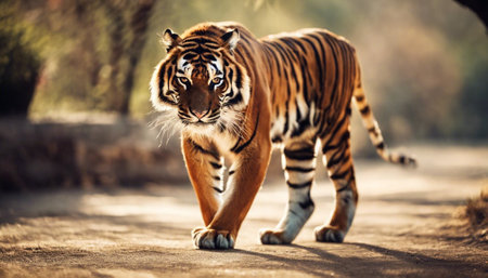A professionally captured wildlife scene of a Bengal tiger strolling through a sunlit forest, highlighting the intricate details of its fur and powerful presence. AI-generated