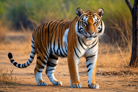 An AI generated illustration of A majestic tiger stands alert amidst a lush jungle setting, its watchful gaze pointed toward the camera