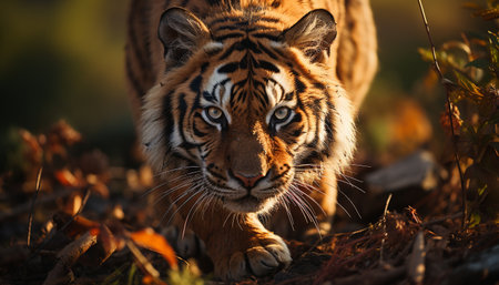 Majestic tiger, wildcat hiding in autumn forest, staring at camera generated by artificial intelligence