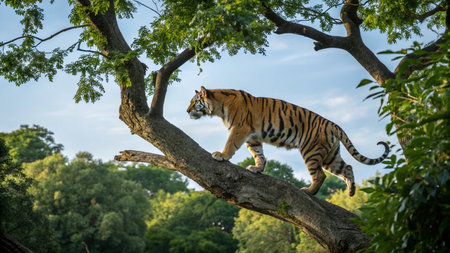 A powerful tiger with striking stripes roams majestically through a lush forest. The greenery accentuates the tiger's vibrant colors and marks a serene yet wild atmosphere. Ideal for wildlife enthusiasts and nature explorations.