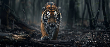 A powerful and majestic Bengal tiger stalks through the dense, gloomy forest, its piercing eyes and distinctive stripes standing out against the shadowy backdrop