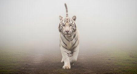 White tiger walking in a foggy meadow with copy space.