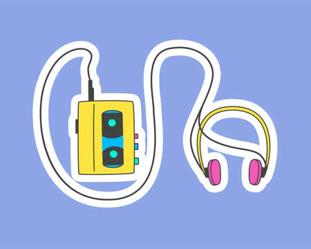 Cassette player of the 90s, sticker. Portable player in a doodle style.