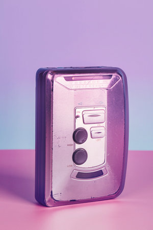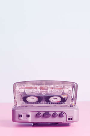 Old audio player with cassette on neon color. retro style. vintage music concept