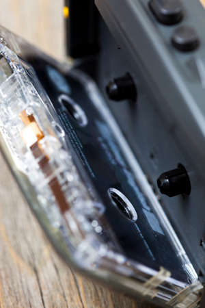 Personal stereo with a cassette tape inside on a worn wooden board