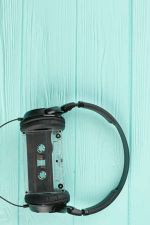 Headphones with audio cassette on colored background. Black headphones and cassette tape on blue wooden background with copy space. Audio technologies for listening music.