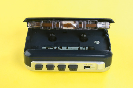 A black cassette player on a yellow background
