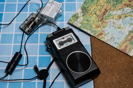 Old micro cassette recorder with its mic and several cassettes next to a map. Vintage journalist equipment.
